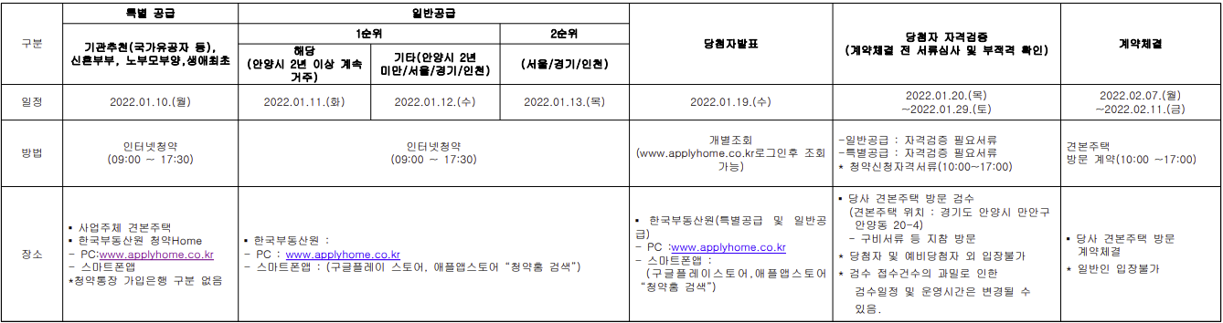 - 당해조건 : 동일 순위 내에 경쟁이 있을 경우 안양시 2년 이상 거주자 우선.
