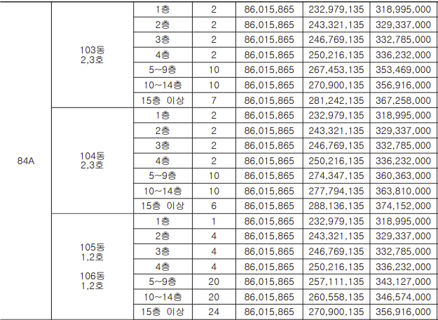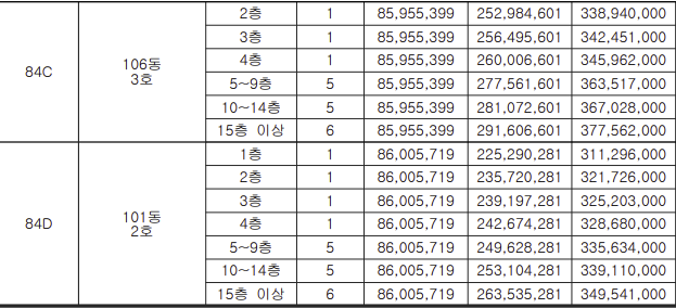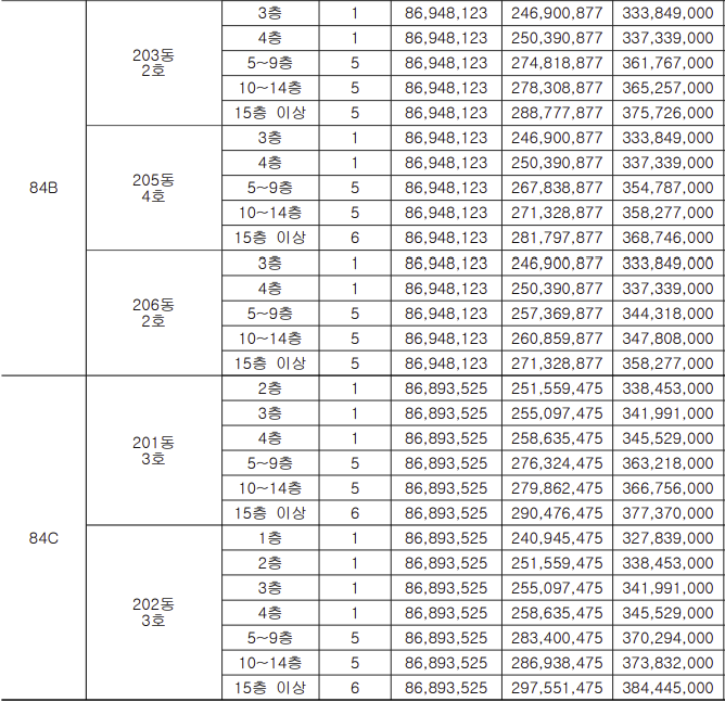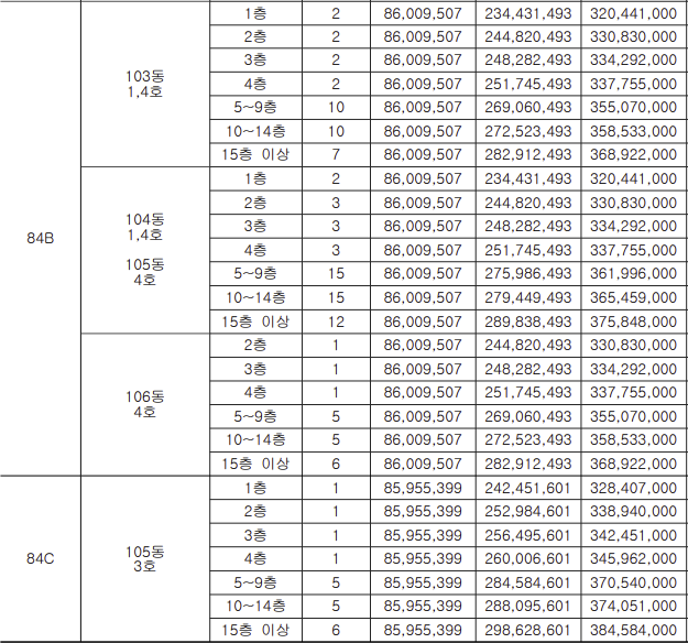 - 84C : 3억 2840만 ~ 3억 8458만