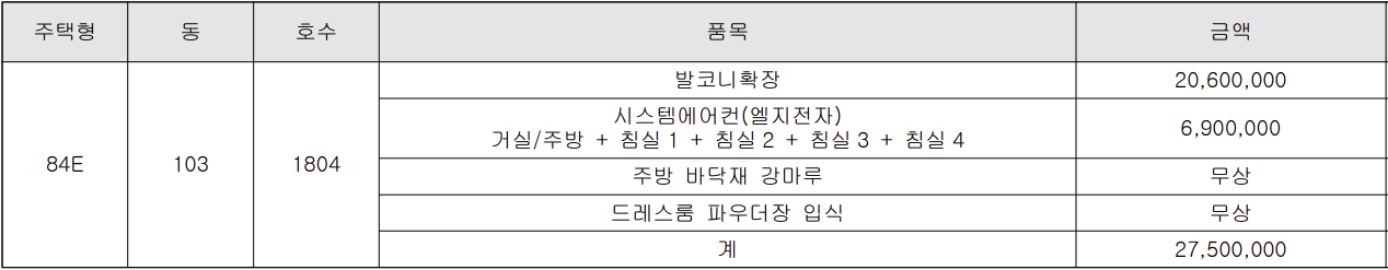 - 하기 옵션으로 계약 후 공사진행 중 계약해지로 인하여 시스템에어컨 위치 조정 및 취소, 기타 옵션 수정 불가.