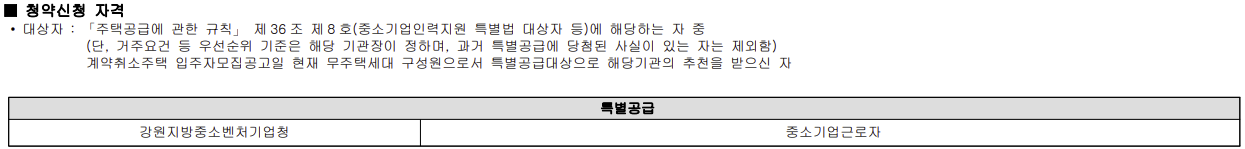 - 주택공급에 관한 규칙 제 36조 제 8호(중소기업인력지원 특별법 대상자 등)에 해당하는 자 중, 계약취소주택 입주자모집공고일 현재 무주택세대 구성원으로서 특별공급대상으로 해당기관의 추천을 받으신 자