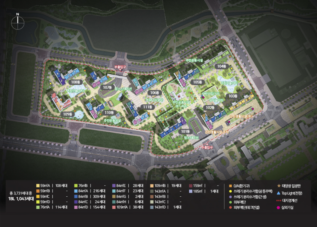 1BL : 아파트 지하 4층, 최고 29층, 11개동, 총 1,043세대 및 부대복리시설