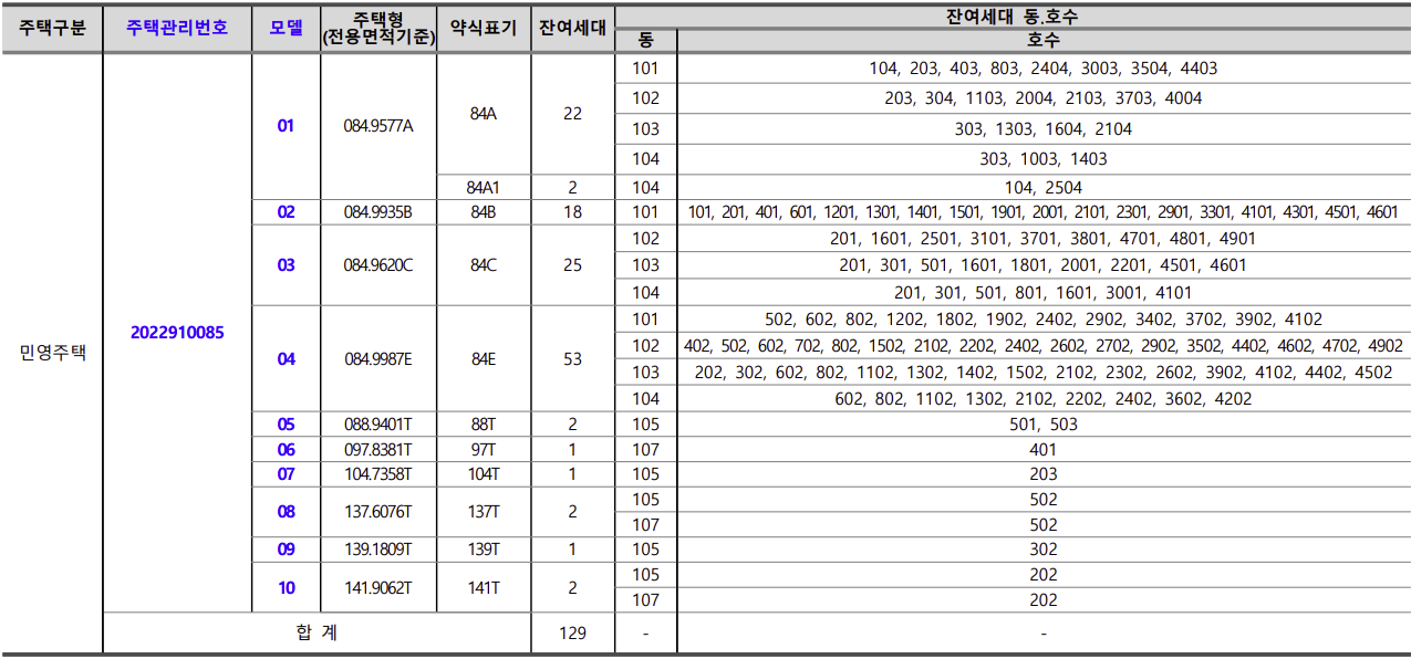 - 공급 규모 : 아파트 지하 2층, 지상 49층 7개동 총 1,114세대 정당계약 및 예비입주자 계약 이후 잔여물량 129세대