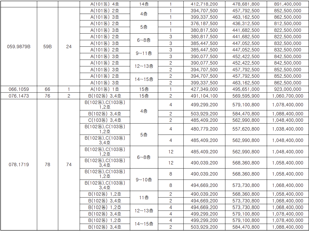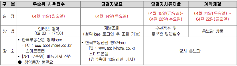 - 공급 규모 : 아파트 지하 3층, 지상 15층 2개동, 10층 1개동 총 216세대 정당계약 및 예비입주자 계약 이후 잔여물량 198세대