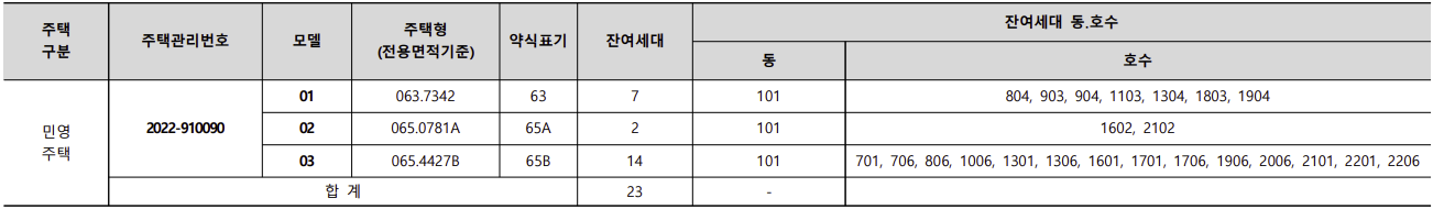 - 공급 규모 : 아파트 지하 2층, 지상 27층 1개동 총 96세대 정당계약 및 예비입주자 계약 이후 잔여물량 23세대